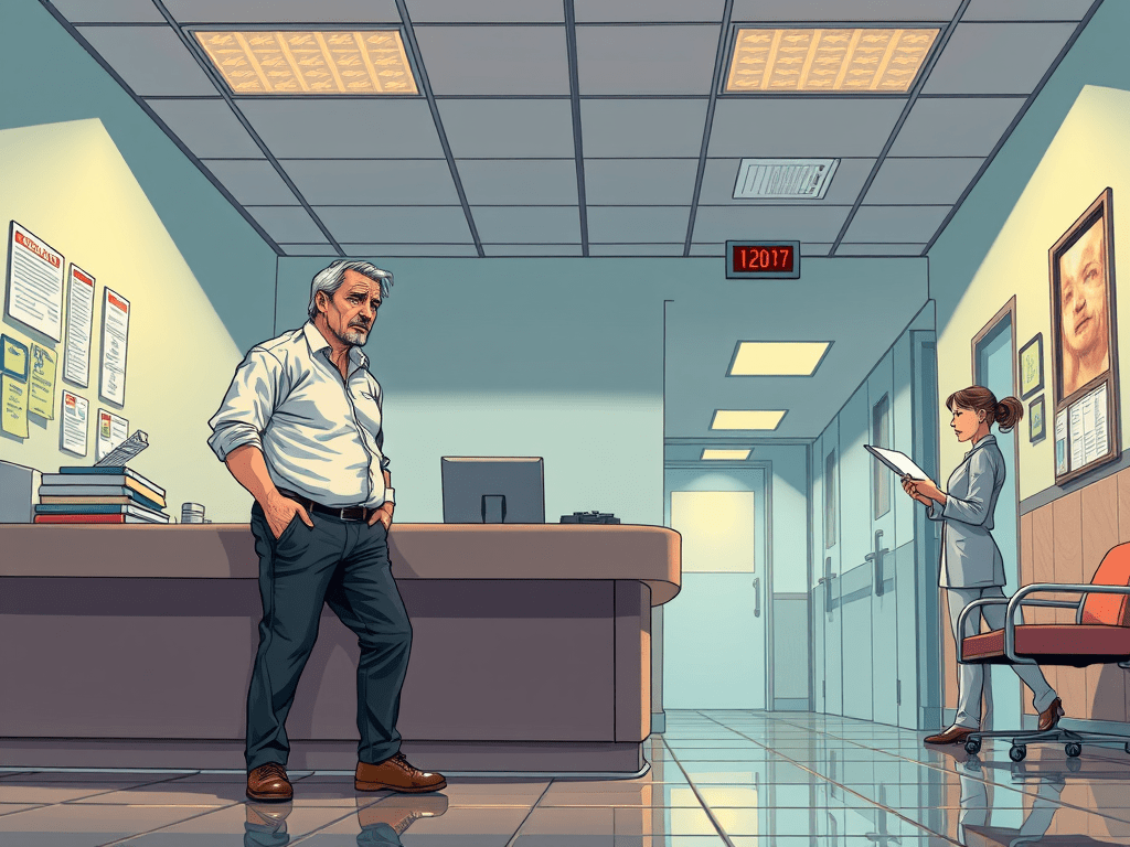Se acerca al mostrador del hospital, tiene unos 45 años entrados a 50 y cojea visiblemente de la pierna izquierda.